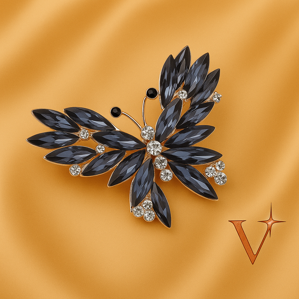 A graceful butterfly LaViena brooch adorned with shimmering crystals with clear and black accents on Rose Gold, crafted to capture elegance and delicate charm.